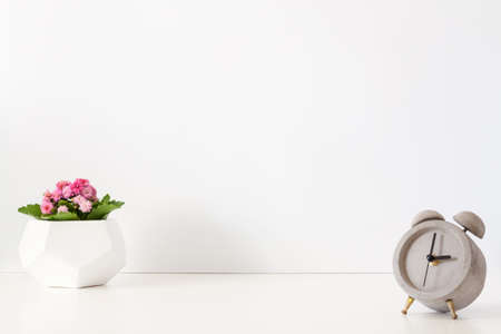 Minimal workplace with flower pot and picture frame on white table. Home office, Copy space for text.