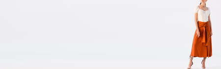 Close up view of modern workspace with copy space, decorations, stationery, coffee cup and croissant on white table with white wall background