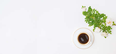 Top view above on gray thin isolated laptop notebook, white cup of espresso coffee, green flowerpot with houseplant on the white background. Banner with copy space for advertisement text