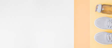 Concept of healthy lifestyle. Flat lay sport shoes, new sneakers on a yellow background