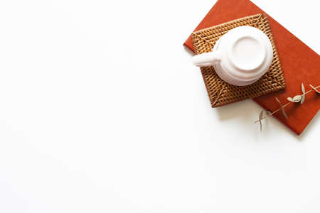 Close up view of minimal home interior design with copy space, notebooks and decorations on white table
