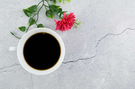 Flower pot and cup of coffee on white table. Copy space for graphic display montage.