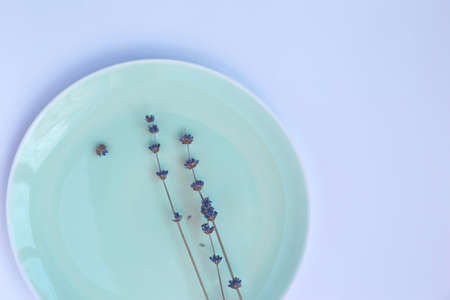 Banner with eucalyptus flower twig in vase in front of blue pastel background. Still life with copyspace.
