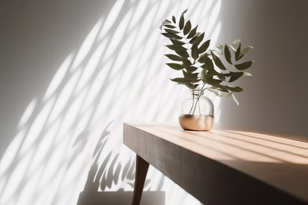 A peaceful indoor moment features a potted plant beside a window, with shadows gracefully cast on the wall by the warm sunlight filtering through.