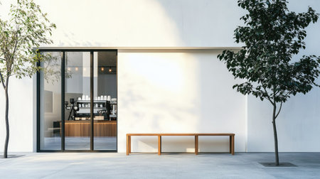 A bright, minimalist coffee shop exterior with a clean white wall, large glass panels, and a simple wooden bench inviting passersby.