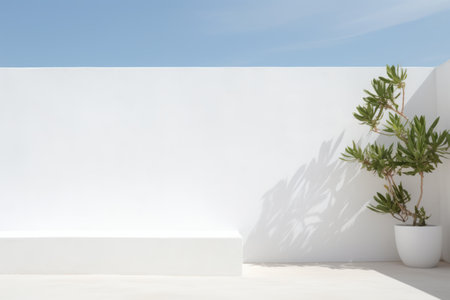 A spacious outdoor area features a simple wooden bench against a pure white wall. Clear blue sky creates a peaceful atmosphere. Ideal for relaxation or enjoying nature.