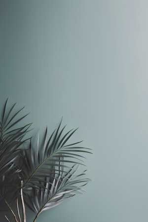 Tropical palm leaves on turquoise background. Flat lay, top view, copy space