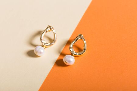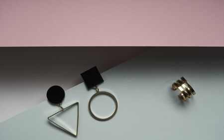 Modern geometric design earrings and golden ring on pastel colors paper background