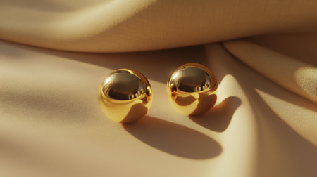 Two shiny gold spheres rest on soft beige fabric, casting gentle shadows and reflections. The smooth surface and warm tones create an elegant and luxurious aesthetic, ideal for various design projects.