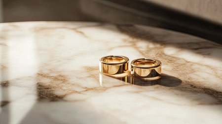 This image features elegant gold rings on a luxurious marble surface, beautifully illuminated by natural light, showcasing stunning textures and warm tones.
