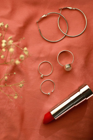 Red lipstick, earrings, rings and flowers on pink background. Top view.