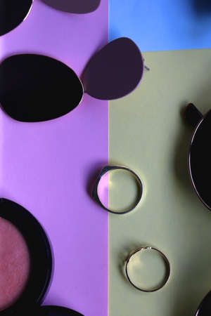 Various accessories, make up products and jewelry on various colorful pastel backgrounds. Flat lay.