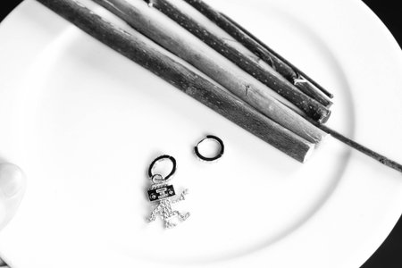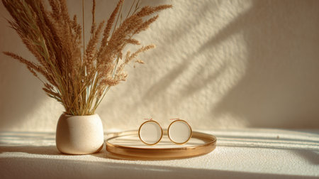 Captivating image featuring elegant round earrings displayed on a golden tray beside a dried grass arrangement in a stylish pot. Soft natural light creates a serene atmosphere.