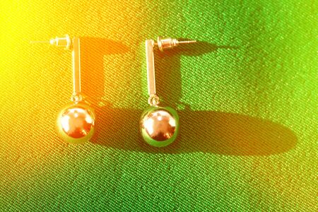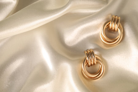 Stylish gold earrings on light silk cloth, top view. Space for text