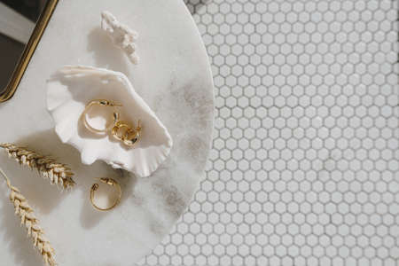Minimal fashion composition with golden earrings in seashell on marble table with mirror and wheat stalks. Flat lay, top view bijouterie / jewelry concept on mosaic tile background.