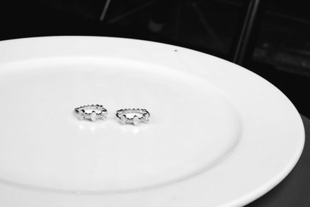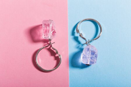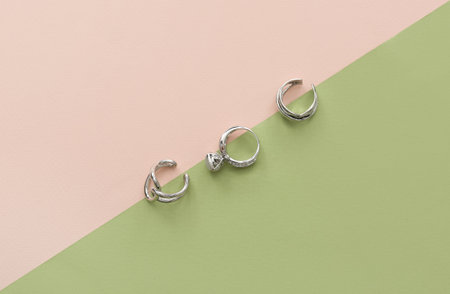 Silver modern stylish earrings on a pink background. Different earrings on a plain pastel background with copy space. High quality photo