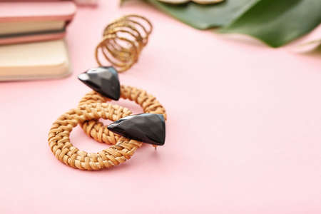 Womens Jewelry. Trendy jewelry on coloured background. Flat lay, top view.