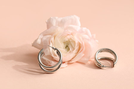 Creative composition with simple silver jewelry earrings set on silk background with dried flowers. Trendy handmade accessories in minimalist style