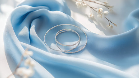 Two silver hoops are placed elegantly on a soft blue fabric, enhanced by the subtle presence of small white flowers in the background, creating a serene and refined setting.