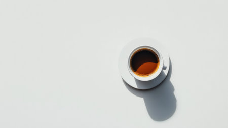 A coffee cup sits on a clean white table, presenting a minimalist aesthetic with a soft shadow, highlighting elegant simplicity and calm ambiance.