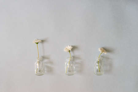 Summer creative composition in minimal style. Three white Marguerite daisy flowers in small glass bottles on white background. Top view, flat lay, copy space