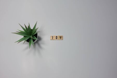 The word Joy written in wooden letter tiles on a white background. Concept family, excitement, and happy.