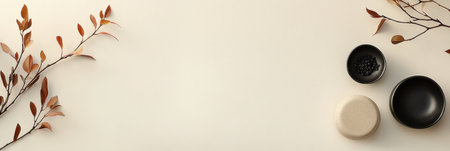 A stylish tabletop features autumn leaves and two minimalist bowls, one light and one dark, creating a serene and elegant atmosphere.