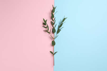 Eucalyptus branch with fresh leaves on color background, top view