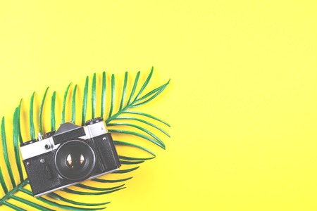 Travelling and photography concept on yellow background.