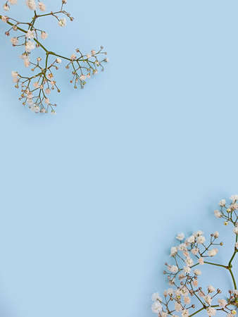 Gypsophila flower on a blue and gold background. Springtime concept with copyspace.