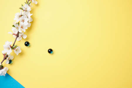 Spring flowers. Holiday card. White flowers of cherry on a blue and yellow background. Place for text, flat lay, top view, copy space
