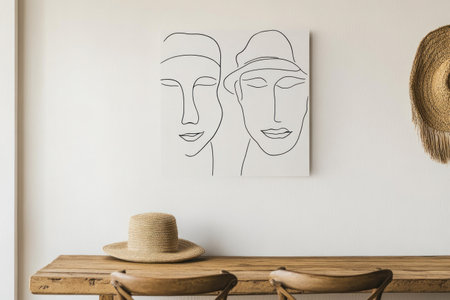 Abstract line art drawing of two faces on a white wall above a wooden table with a hat and basket, in a minimalist style with simple shapes, soft lighting, and neutral colors. High-resolution, professional photograph. --ar 3:2 --v 6.1 Job ID: 0e3ecf99-881b-4344-afbb-284a2b5919dd