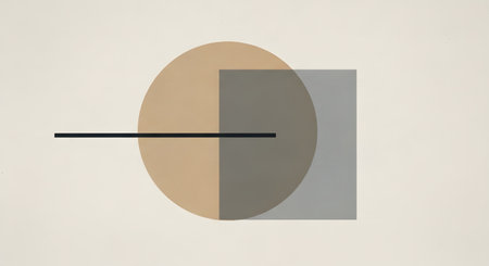 A minimalist abstract artwork featuring overlapping tan oval and grey rectangular shapes with a thin black horizontal line against a light background.