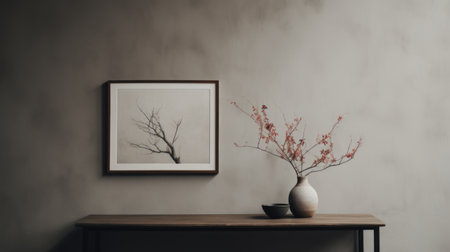 a small vase with two white flowers sits gracefully against a large blank wall, capturing the essence of japanese photography. the earthy color palettes and twisted branches add a touch of natural beauty to the scene. the monochromatic artworks, with light red and dark gray tones, create a visually striking contrast. this high-resolution image in 8k resolution showcases muted, earthy tones that evoke a sense