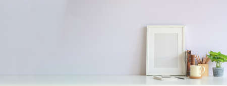 Empty white picture frame, pencil holder and houseplant on white table. Copy space.