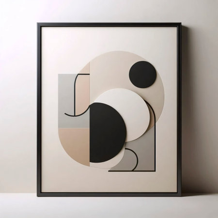 This artwork features an abstract composition of geometric shapes and organic elements in a harmonious blend of colors, ideal for modern decor and artistic settings.
