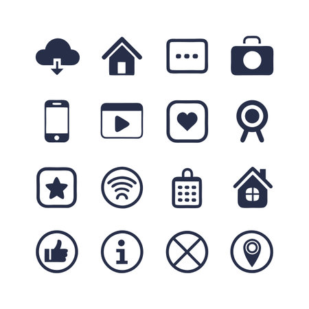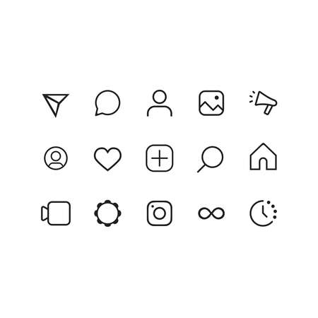 Set of social media icons like, follower, comment, home, camera, user, search. Vector illustration.