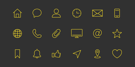 Business Card Line Icon Set. Yellow Simple Communication Linear Icon. Contact Info Pictogram. Address, Email, Phone, Message, Chat. Set of Website Pictogram. Editable stroke. Vector illustration