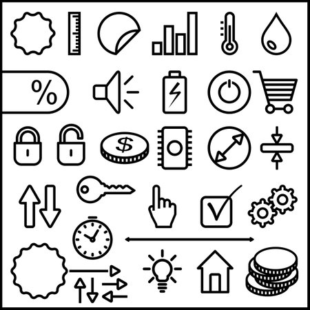 This graphic showcases a collection of line art icons related to business and technology. The icons are primarily in black and white, featuring a simple, clean design. The composition is straightforward, likely intended for use in design projects, presentations, or various commercial applications. The style emphasizes clarity and ease of recognition.