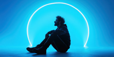 A person sits in profile against a bright blue neon circle, reflecting introspective thoughts in an artistic studio setting. The vibrant colors create a striking atmosphere.