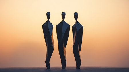 Abstract sculptures of three figures at sunset, minimalist art concept
