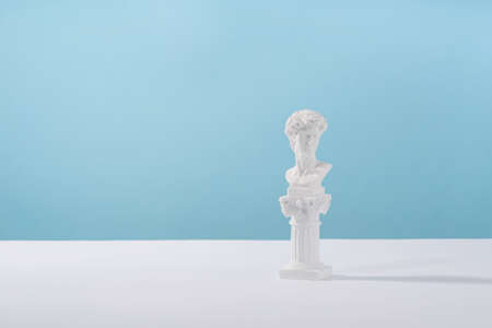 Antique Plaster David bust on blue background. concept pop. Minimal still life photography