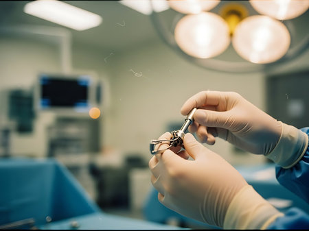 Close-up of surgeons hands holding dental instruments in operating room.