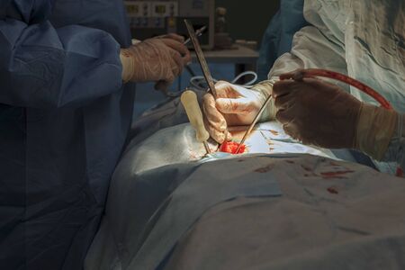 Team surgeon at work in operating room. Surgical light in the operating room. Preparation for the beginning of surgical operation with a cut. The surgeon is performing surgery on the patient.