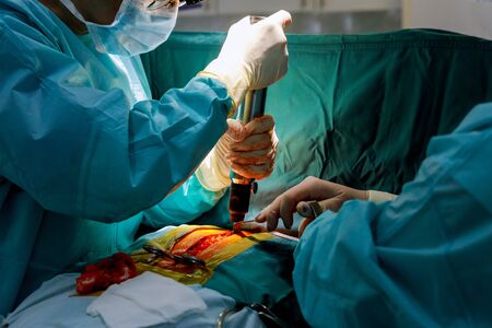 Photo of a real operation on the spine. The surgeon and assistant perform the treatment. In the frame of a medical instrument and blood suction. There are bloodstains on the sheet.