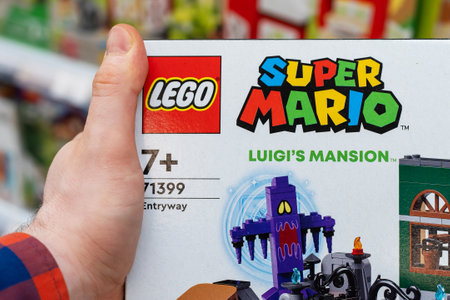 Lego Super Mario constructor in hands of buyer. Lego is a popular line of construction toys manufactured by the Lego Group. Minsk, Belarus, 2022
