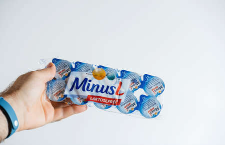 POV male hand holding Minus L laktosefrei milk for coffee