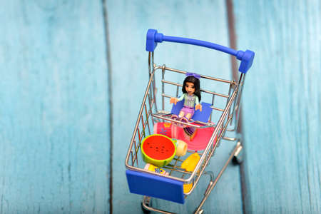 Cart with a doll, toy products are in the consumer basket.