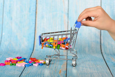 Man's hand carries a trolley with multi-colored letters, a consumer basket with the alphabet on a blue wooden background