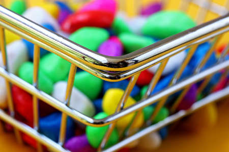 a lot of colorful candies in shopping cart